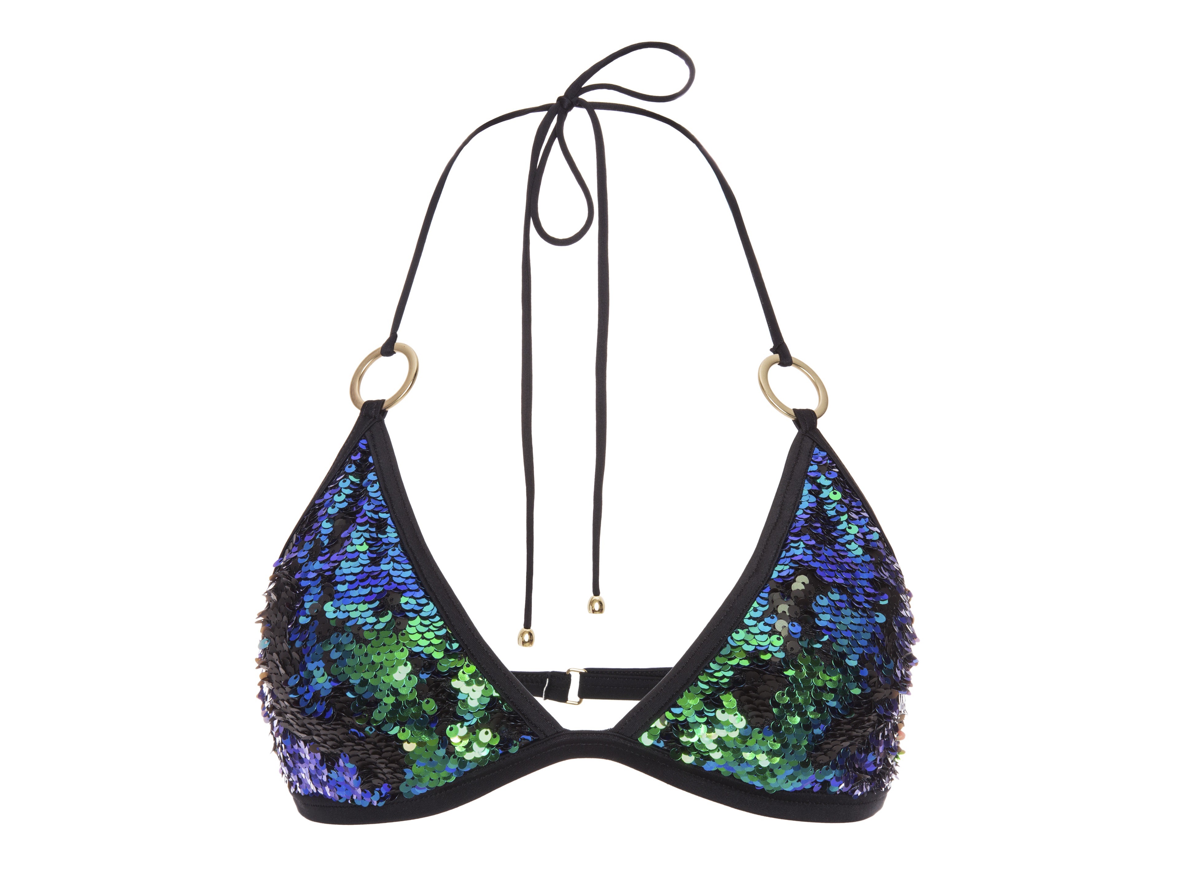 Jeśli chcesz zadać szyku wyjątkową stylizacją to bikini Cameleo jest dla Ciebie. Cały staniczek obszyłyśmy dwustronnymi cekinami. Możesz je ułożyć gładko w dół aby uzyskać kolor cameleon mieniący się odcieniami zieleni, niebieskości i fioletu lub do góry jeśli wolisz czarny mat. Niektóre z Was lubią też wersję „poczochraną” aby wydobyć z niego pełnię blasku. Całości dopełniają ozdobne kółka, do których przyszyłyśmy sznureczki, które możesz zawiązać na szyi.