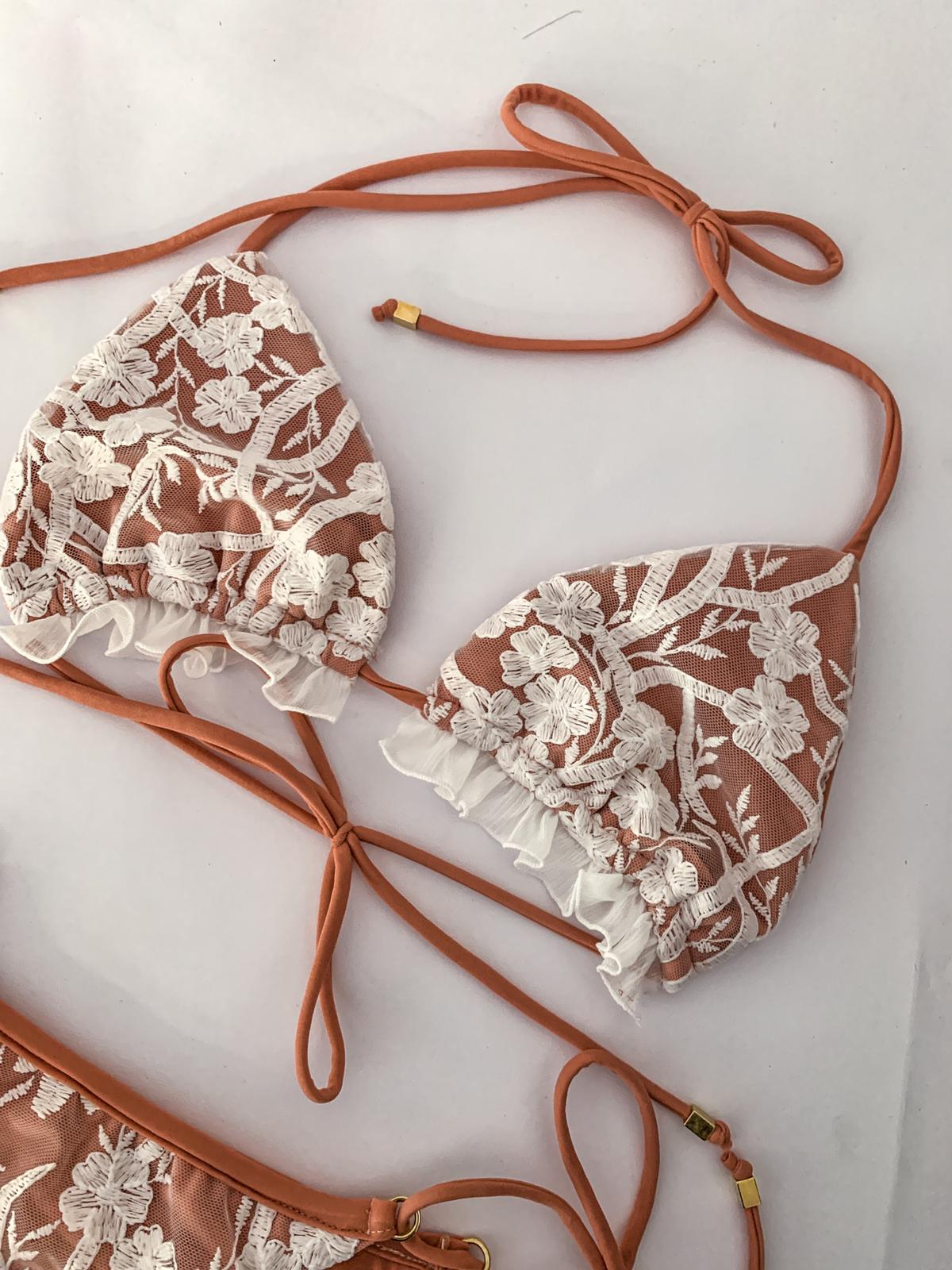 BELLA to romantyczna odsłona klasycznego bikini. Trójkątny staniczek obszyłyśmy (kremową, białą, lawendową) koronką. Jego dół ozdobiony jest dodatkowo muślinową falbanką nadającą lekkości i zwiewności. Niektóre z Was wpadły na genialny pomysł i noszą staniczek na 2 sposoby: klasycznie falbanką do dołu lub obracają miseczki tak, ze falbanka pięknie podkreśla dekolt i optycznie powiększa piersi.