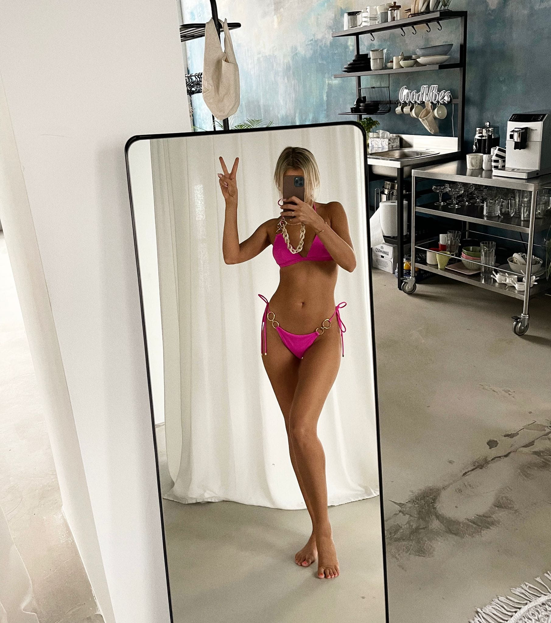Obwód na biodrach możesz regulować wiązanymi cienkimi sznureczkami zakończonymi metalowymi koralikami. Boczne sznureczki sa na tyle długie, że możesz spokojnie zaciągnąć je wyżej na biodra, wydłużając i wysmuklając tym samym nogi.