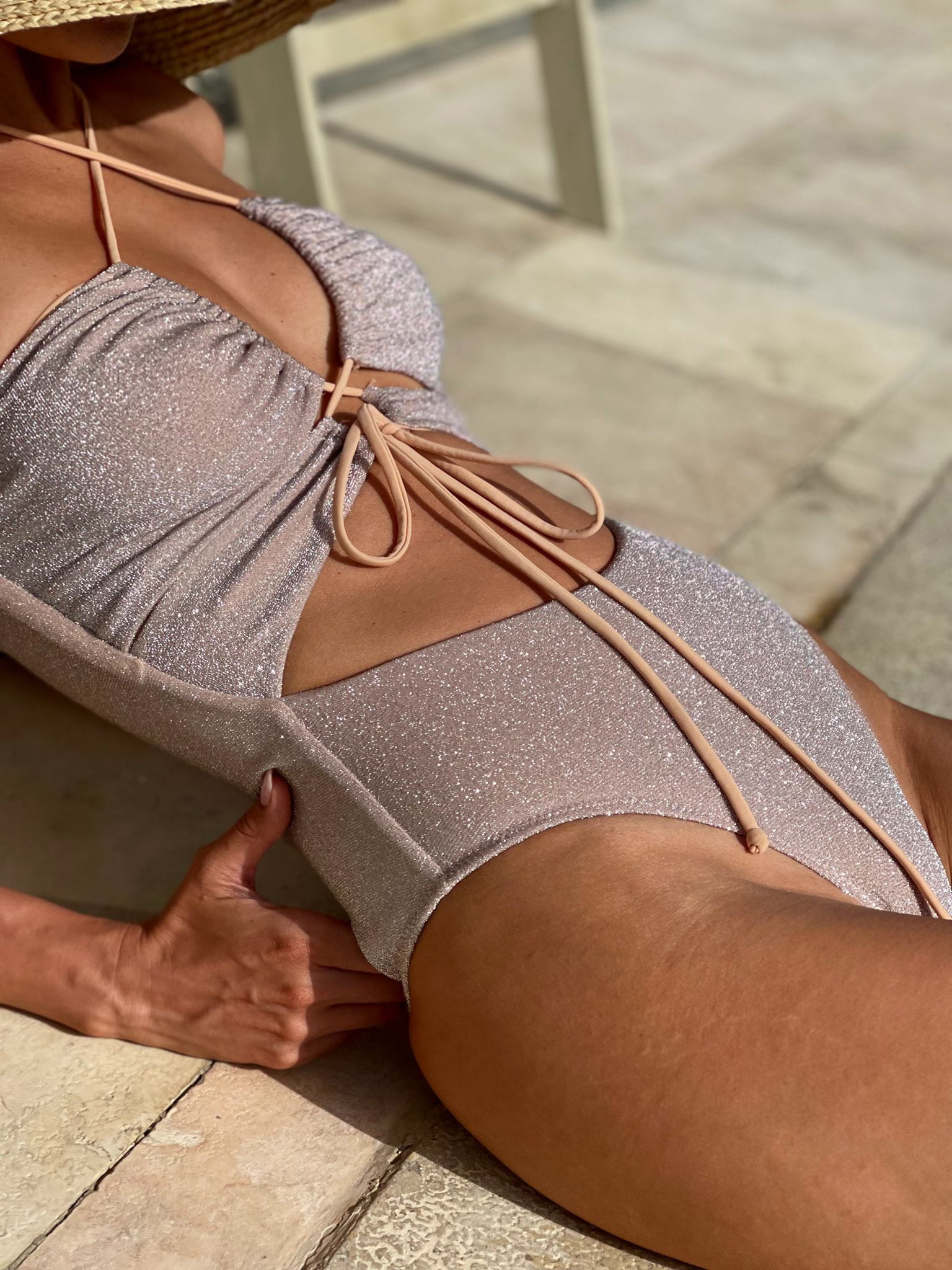 Materiał błyszczący ze srebrną nitką o delikatnym meszku.