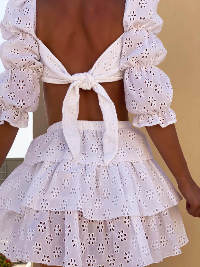 Przedstawiamy Wam nasze nowe koronkowe cudeńko – komplet w stylu boho. Santorini to świetny pomysł na stylizację w upalny dzień, gdyż całość jest wykonana z bawełnianej, przewiewnej koronki.