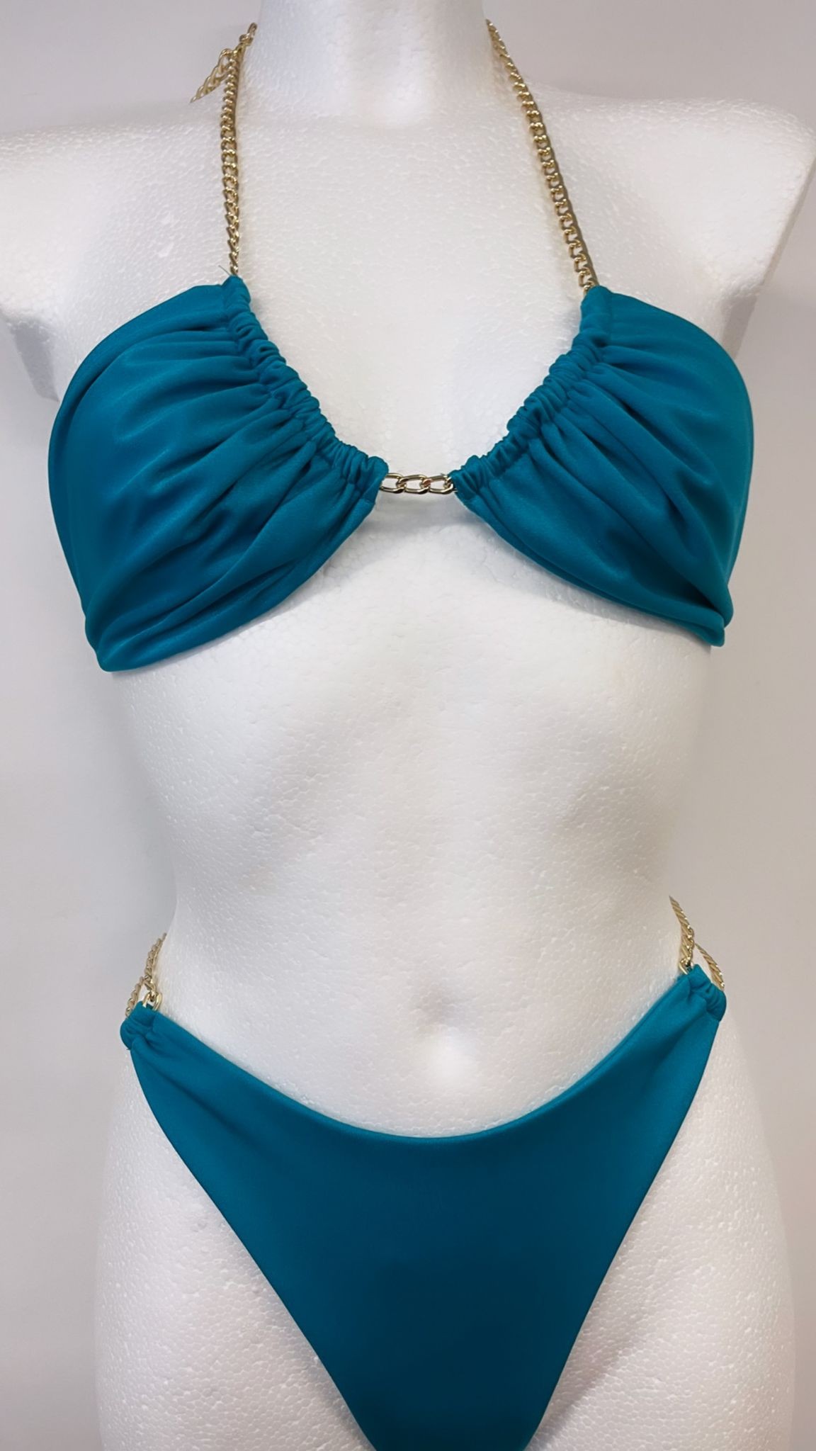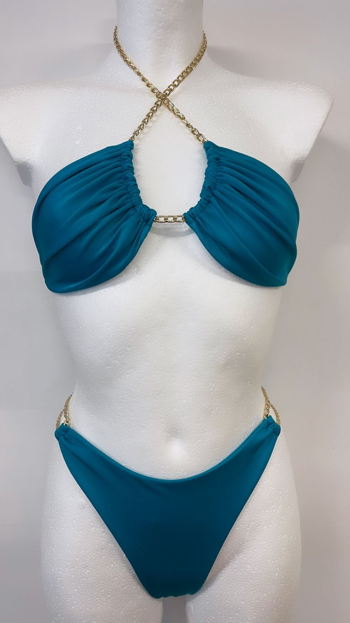 Collar to nasz kolejny pomysł na wykorzystanie biżuteryjnych łańcuszków nikiel free w modzie plażowej. Trójkątny staniczek przymarszczony na dekolcie zapinasz na szyi za pomocą karabińczyka. Możesz też przed zapięciem skrzyżować łańcuszek aby dekolt był bardziej ozdobny. Staniczek ma wyjmowane wkładki, wiec sama zdecydujesz czy chcesz je zostawić czy wyjąć. Zarówno rozstaw miseczek jak i obwód pod biustem jest w pełni regulowany. Niektóre z Was wpadły na pomysł aby staniczek zakładać na odwrót, dzięki czemu łańcuszek tworzy ozdobę zapinaną z przodu na brzuchu.