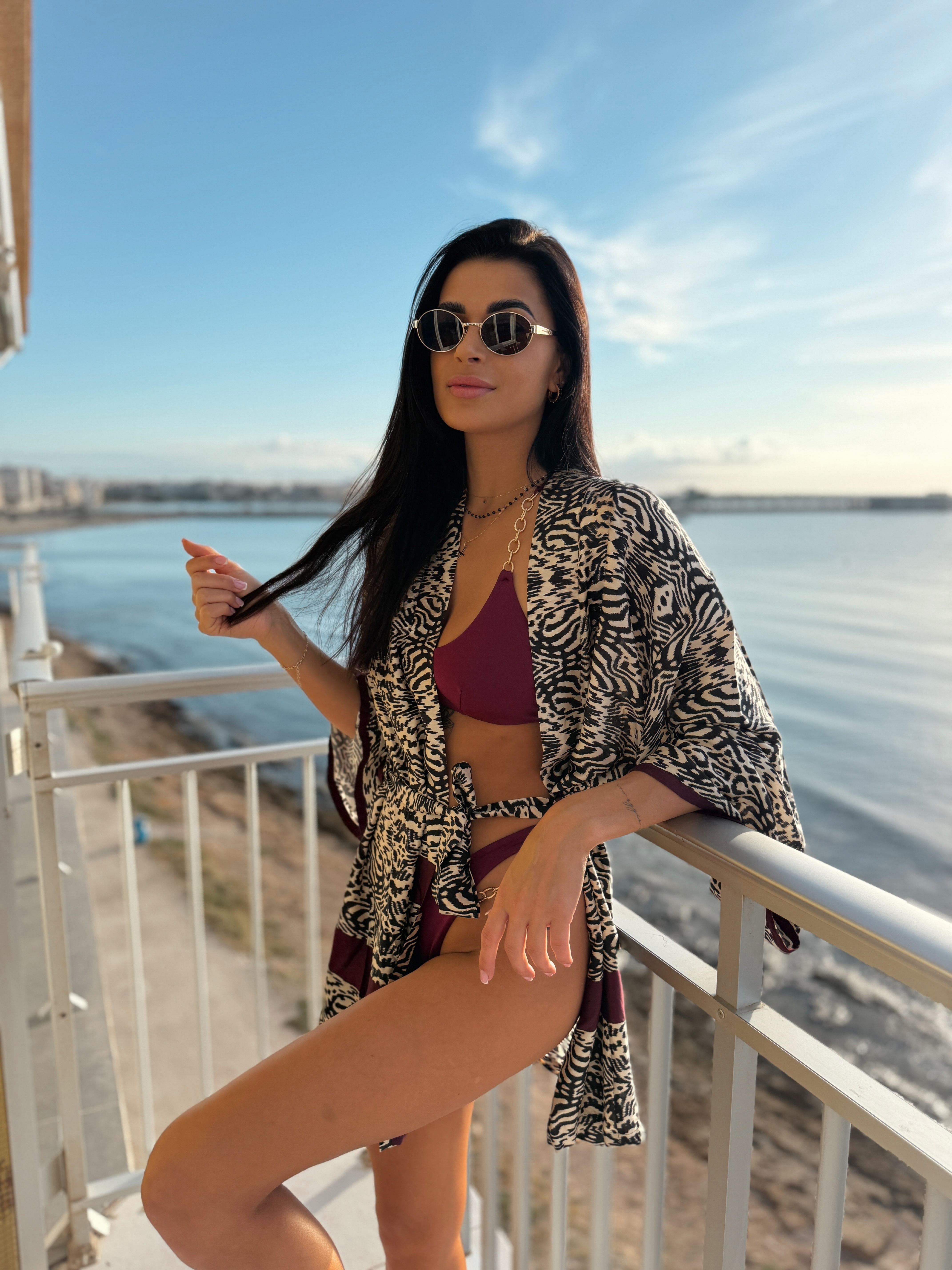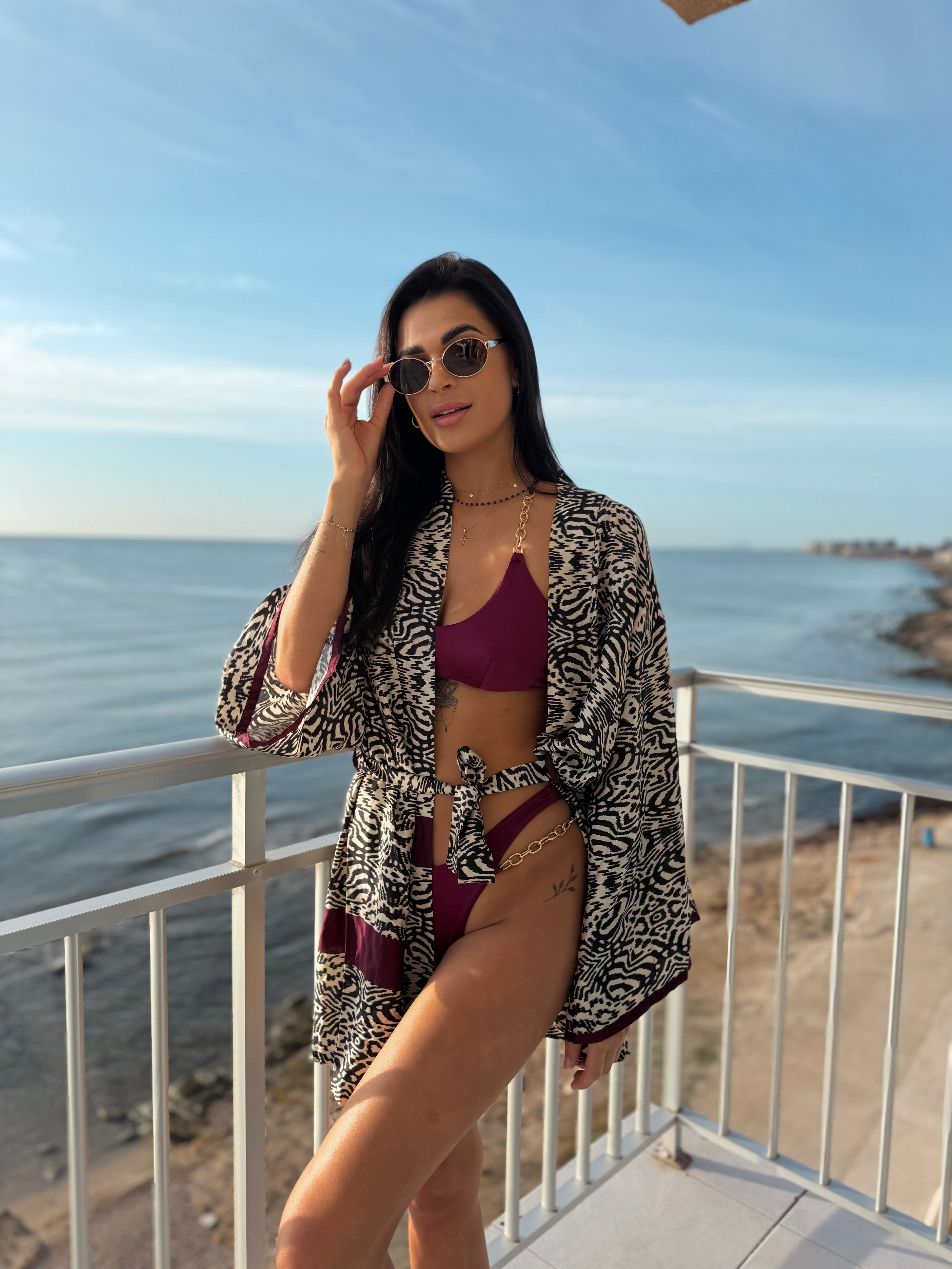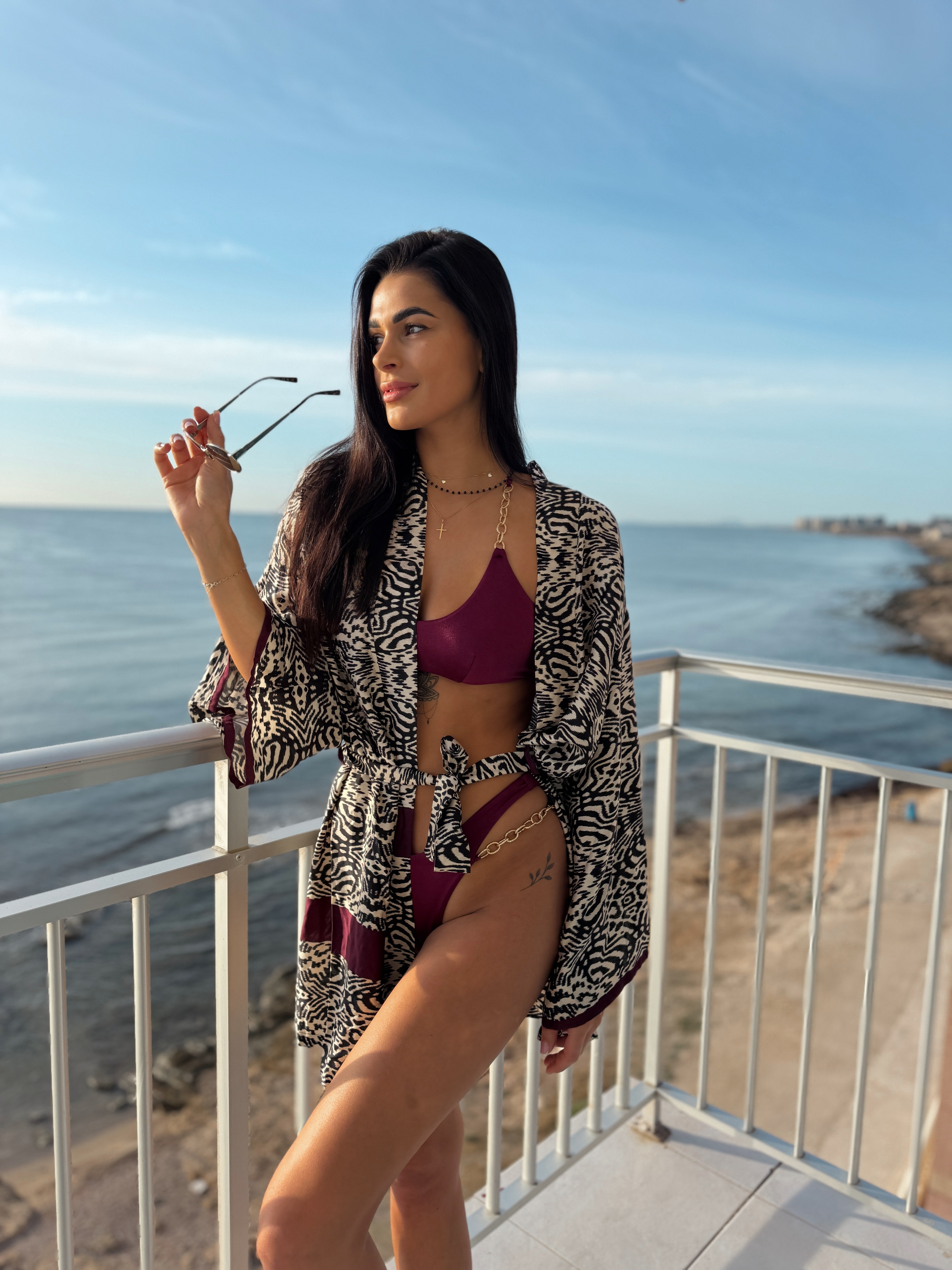 Bikini z dekoracyjnymi łańcuszkami, modne w kroju i ponadczasowe. Góra o kroju topu ładnie zbiera nawet małe biusty. Dół klasyczny podkreślający pupę. Produkt wyprodukowany w Polsce.