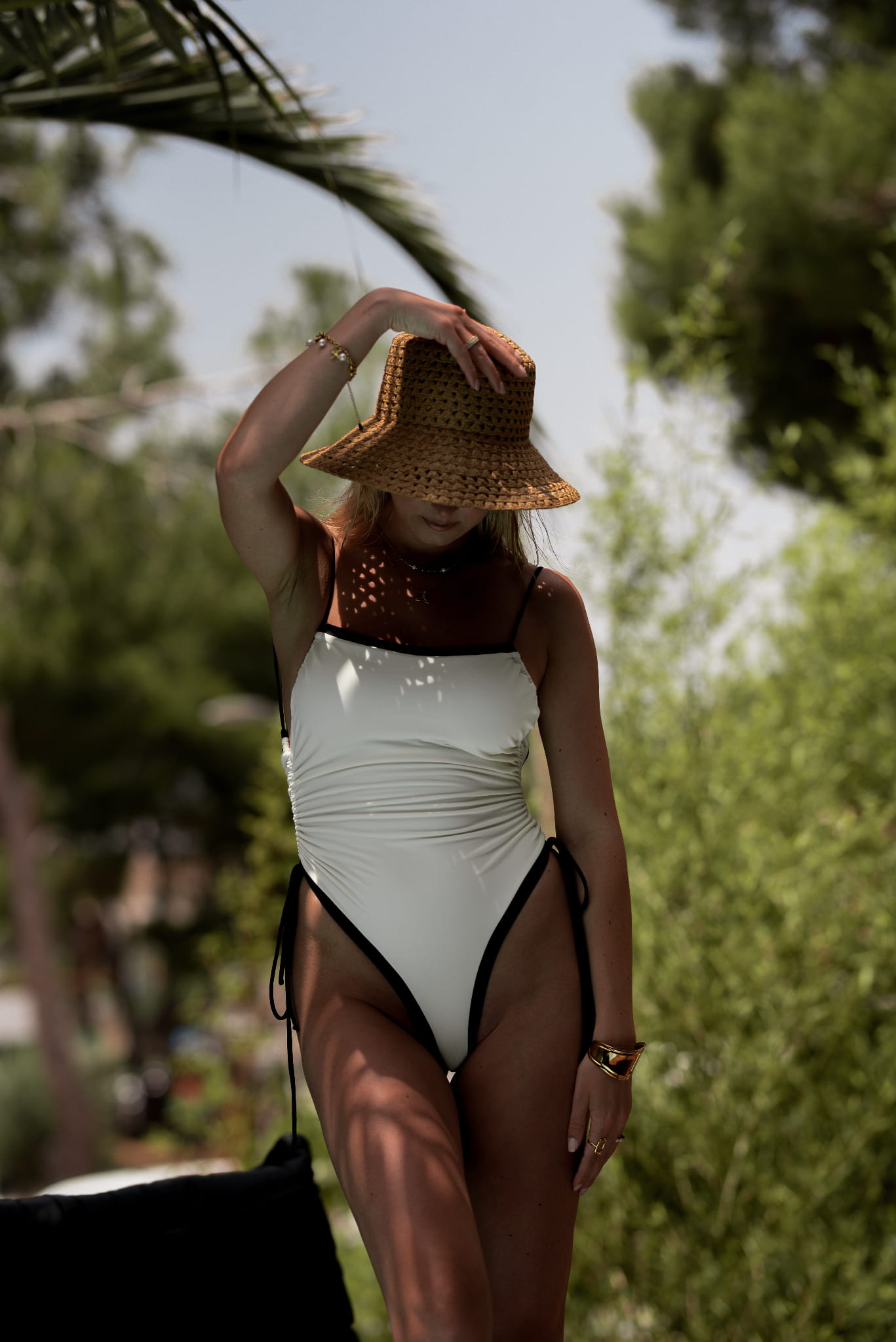 Wyjątkowy, bardzo kobiecy strój jednoczęściowy. Wymodelowanie podkreśla krągłość pośladków, a wysoki podkrój nogawek wydłuża optycznie nogi. Ściąganymi sznureczkami można wyregulować sobie zarówno długość ramiączek, głębokość dekoltu jak i podkrój nogawki. Jeśli mocniej ściągniesz sznureczki na boku to stworzy się ładne przymarszczenie. Do kostiumu dołączone są miękkie wkładki, które możesz włożyć w specjalnie przygotowane "kieszonki" na wysokości biustu. Całość ozdobiona jest lamówkami. Mimo to strój jest dosyć minimalistyczny i elegancki.