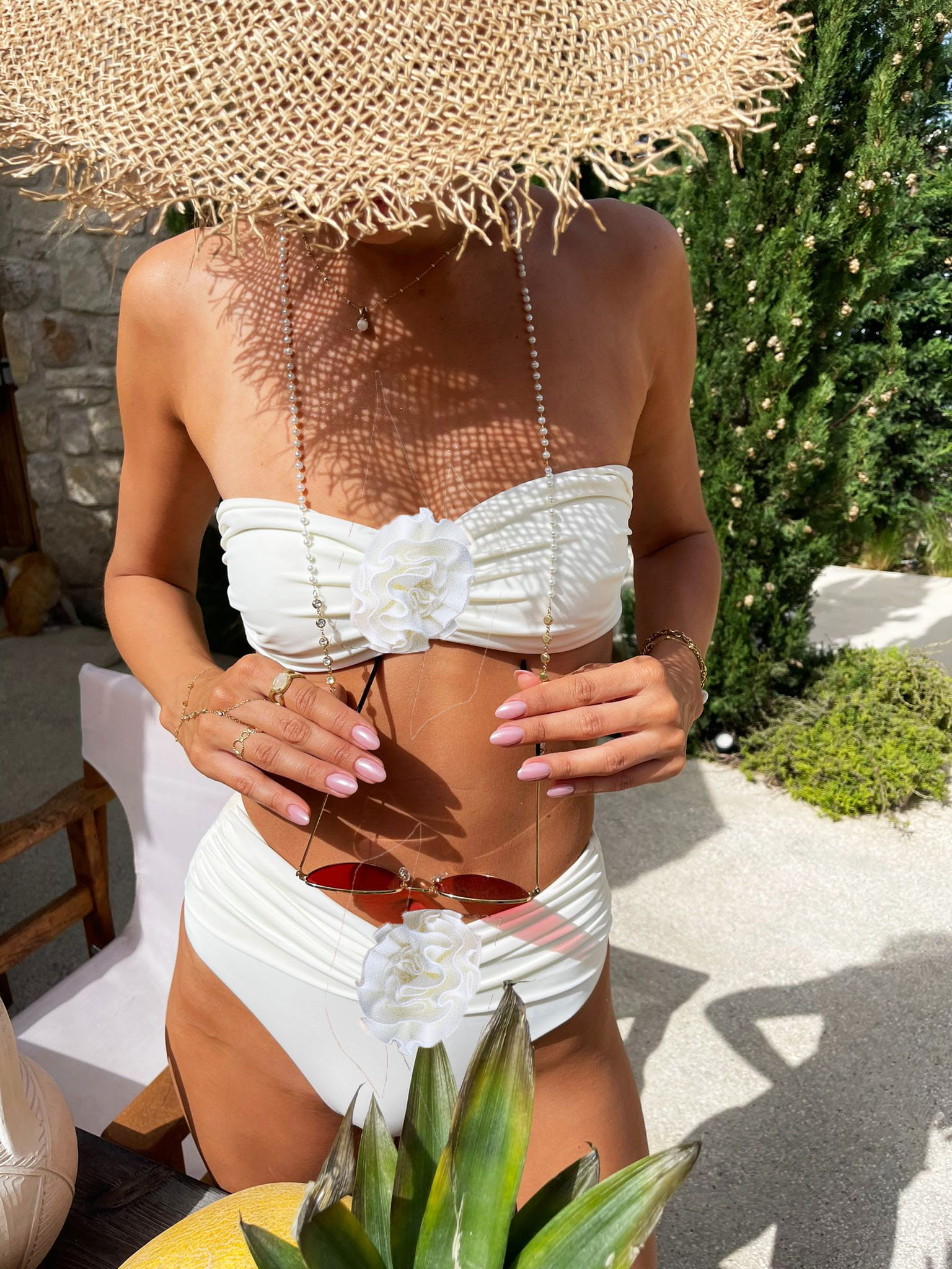 Staniczek jak i majteczki uszyte z podwójnego materiału - dzięki czemu nie prześwituje i ładnie maskuje. Wyjmowana miska. Fiszbiny stabilizujące z boku, dzięki którym unikniemy zwijania się staniczka. Wiązanie na plecach pozwala idealnie dopasować strój. Marszczenie na biuście lekko powiększą nasze piersi. Majteczki o wyższym stanie z marszczeniem na brzuchu, które niwelują i idealnie tuszują odstający brzuszek. Model dostępny do rozmiaru XL.