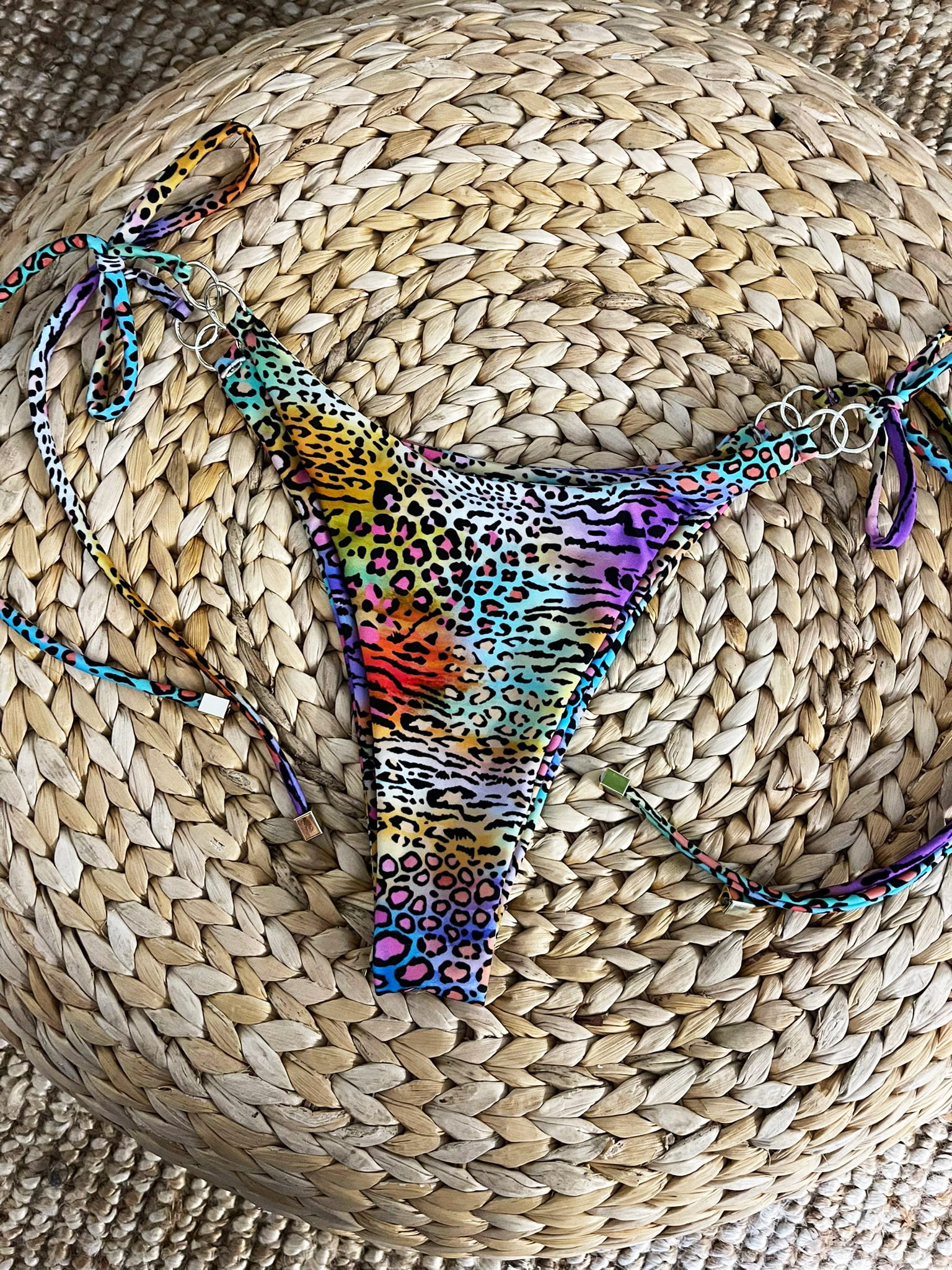 Model bikini Fiji to nietuzinkowa propozycja dla odważnych, pewnych siebie kobiet. Góra bikini pięknie podkreśla i modeluje piersi. Ozdobne łączniki dodają seksapilu. Góra nie posiada misek. Wiązany na szyi i plecach, co ułatwia dopasowanie. Dół bikini wiązany na bokach, ozdobne złote łączniki. Majteczki wycięte, pięknie podkreślają pupę. Dostępny w wielu wariantach kolorystycznych.