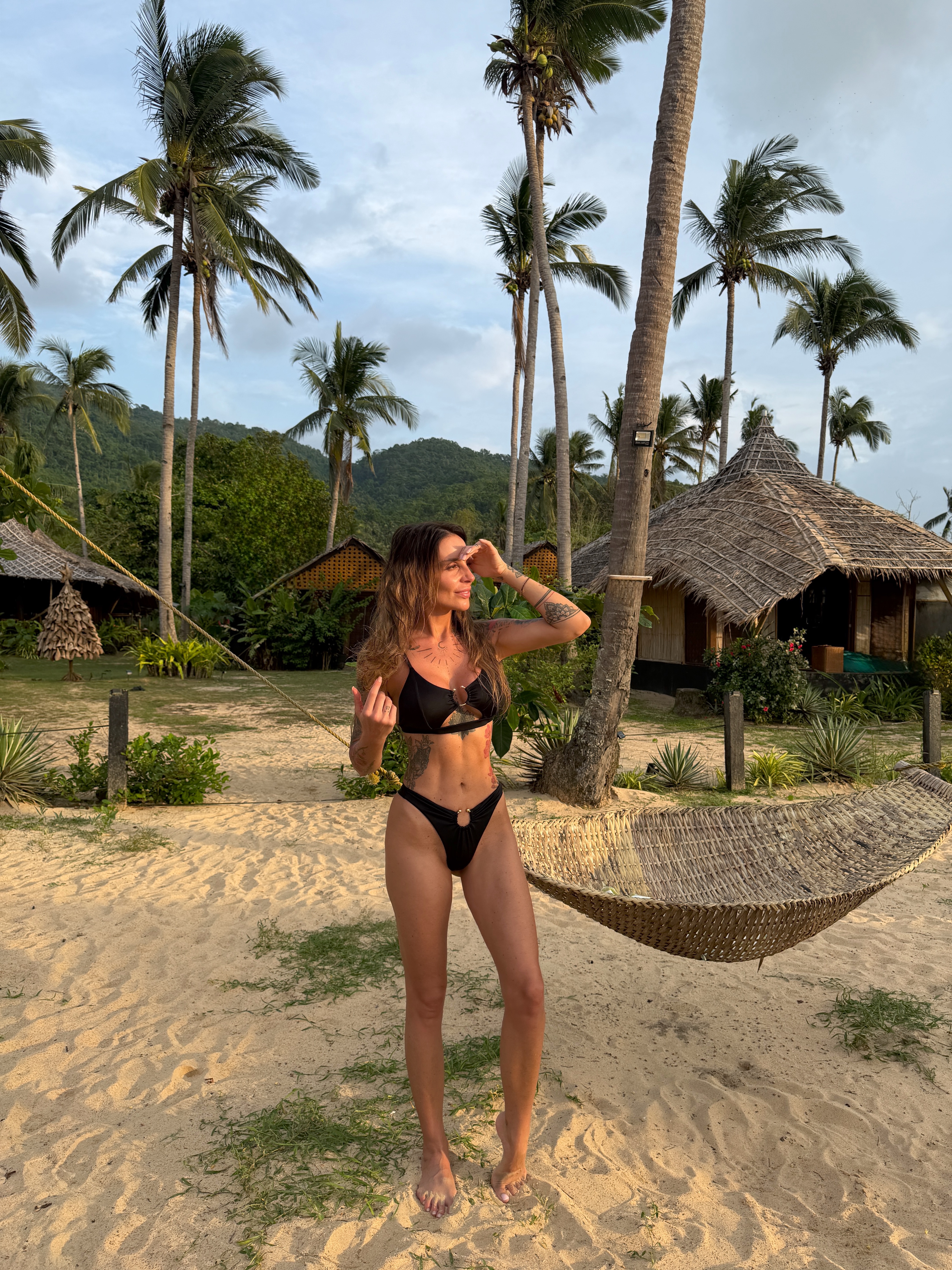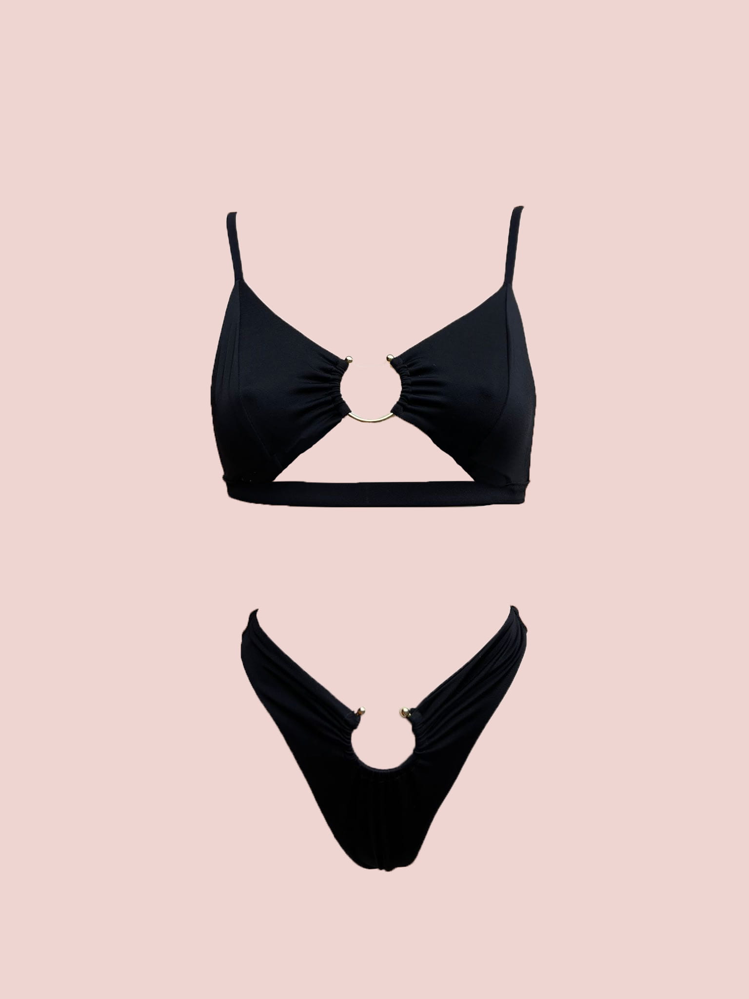 Model Queen z super złotym dodatkiem między piersiami. Zapinany na plecach i modnym wycięciem między biustem. Miseczka tak skrojona, że pięknie eksponuje biust nawet ten najmniejszy. Majteczki z lekko wyższym stanem i również złotym dodatkiem z przodu. Bikini dla osób, które lubią modę i szalone kroje. Tył pięknie wycięty, podkreślający pośladki.