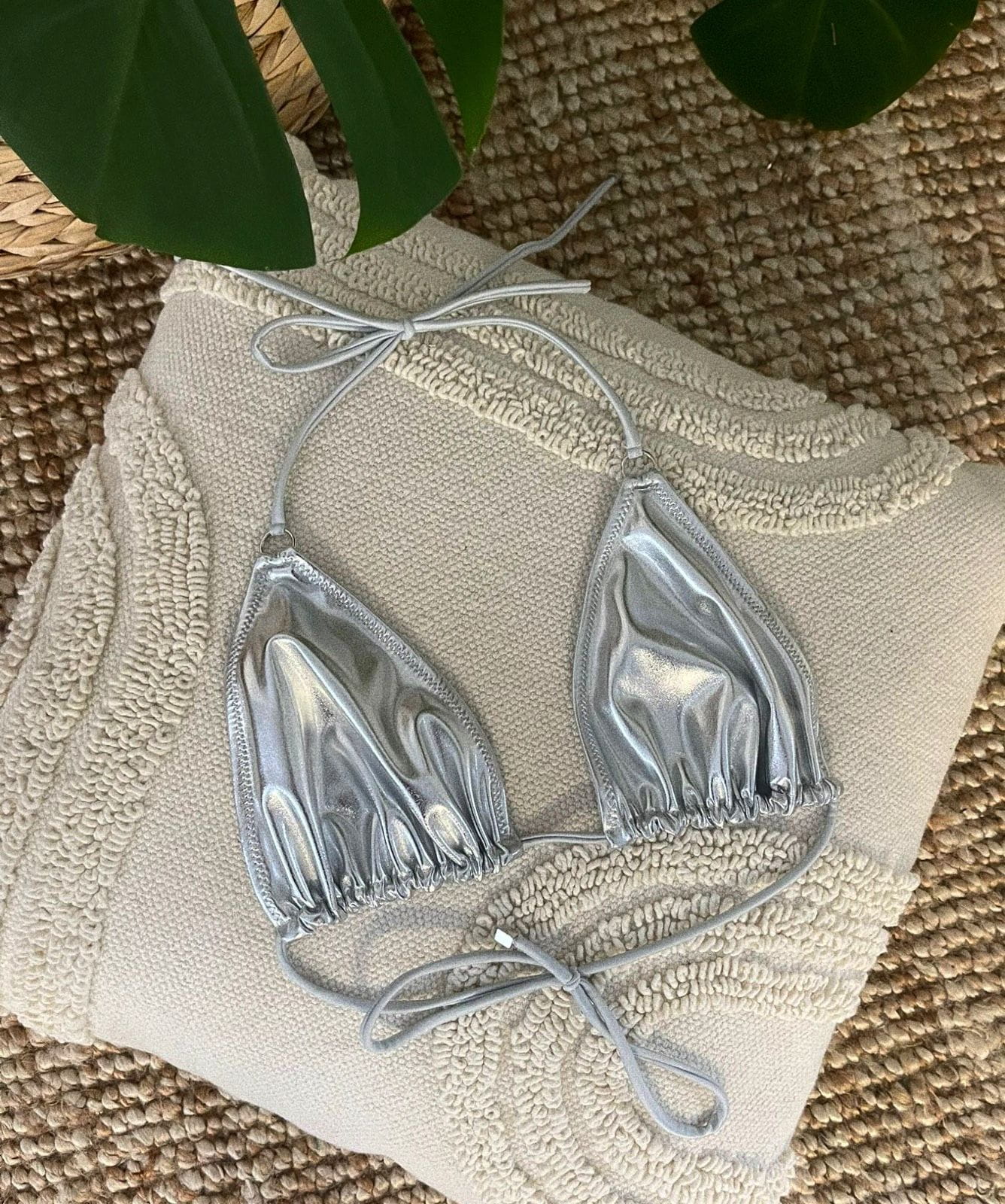 Model Metallic to nie tuzinkowe trójkąty uszyte z oryginalnego metalicznego materiału. Idealnie sprawdza się na małych biustach jak i tych większych. Miska push up z możliwością wyjęcia. Wiązanie na szyi i plecach pozwoli pięknie dopasować strój. Ponadczasowy klasyczny krój sprawdzi się na każdej sylwetce. Dół bikini wiązany na bokach.