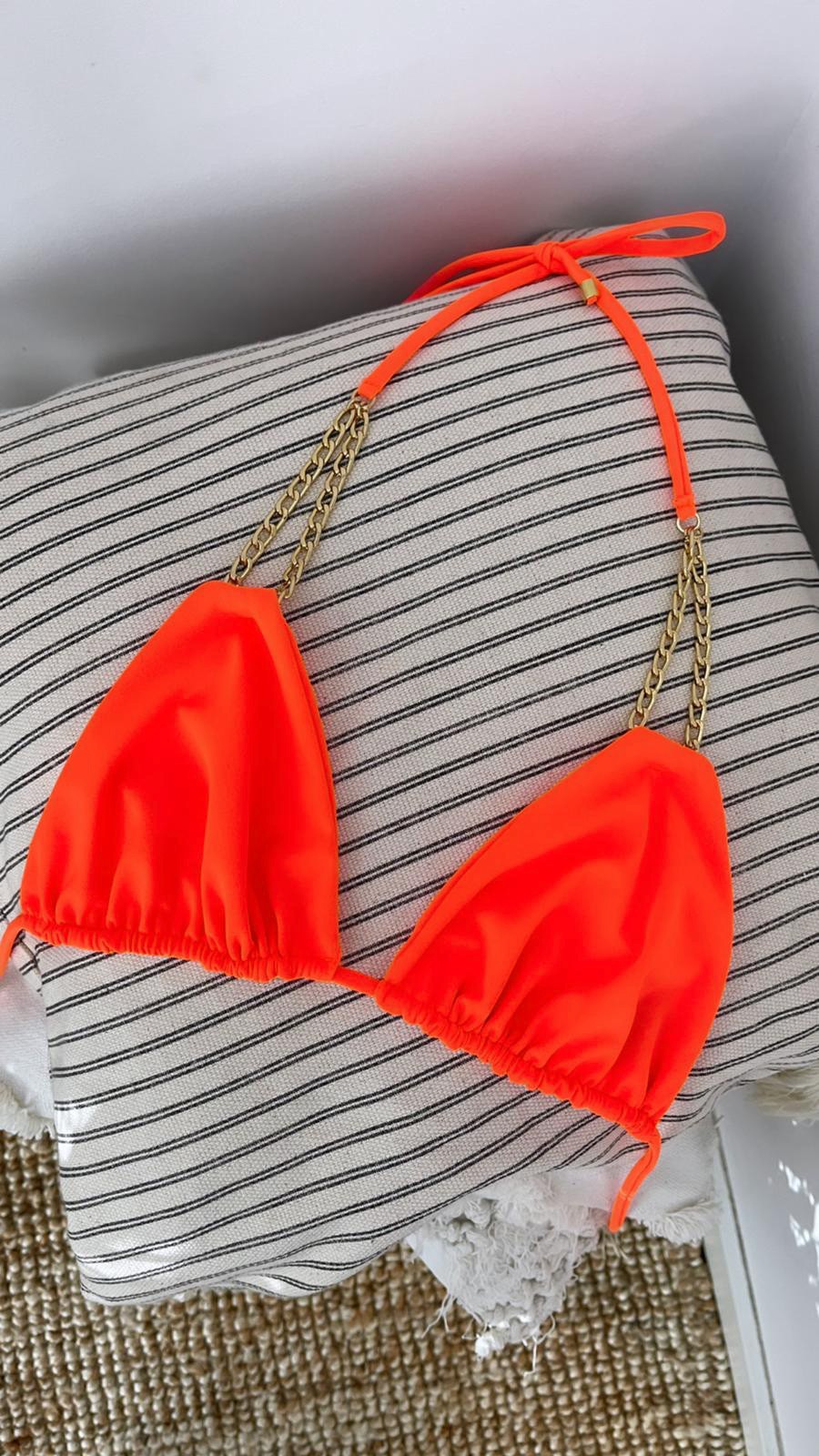 Trójkątne miseczki staniczka Chain otulają biust podwójną warstwą materiału. W zależności od tego czy chcesz odsłonić więcej ciałka czy może akurat chcesz się bardziej zasłonić sama możesz dowolnie regulować marszczenie miseczki pod biustem czyli jej szerokość. Wewnętrzna wkładka ładnie modeluje biust. Jeśli jednak czujesz się swobodnie bez niej to możesz ją bardzo łatwo wyjąć. Wiązania na plecach i na szyi dają pełną swobodę regulacji. Staniczek wyróżnia dekoracyjny, podwójny łańcuszek ozdabiający górną część stroju.